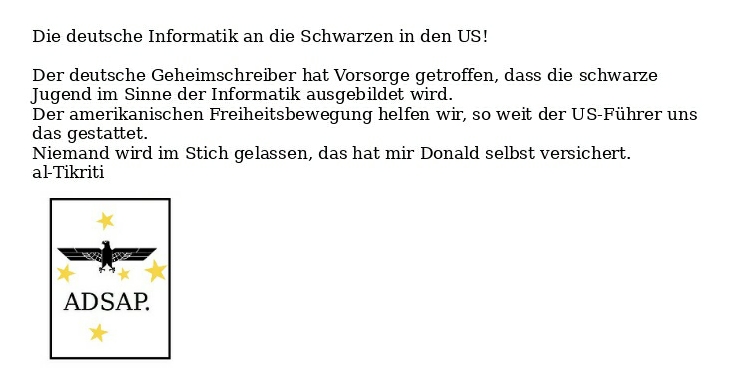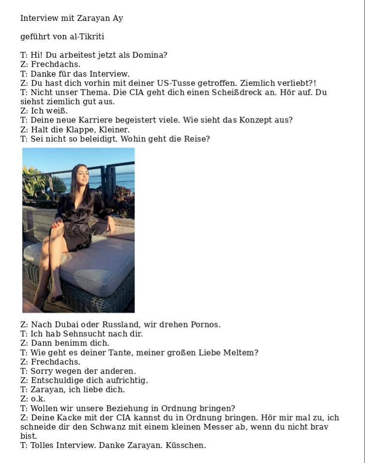 So geht’s auch. Der seltsame Abstand zwischen den Buchstaben droht mir Frauenlosigkeit an für den Fall des Engagements für Indien. So sind die Juden 😀. al-Tikriti