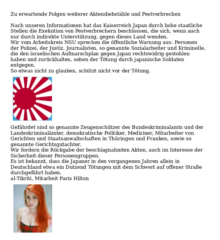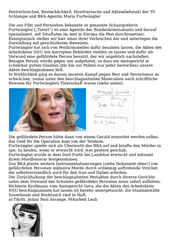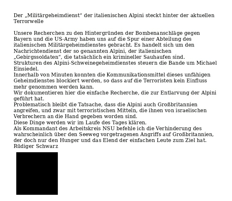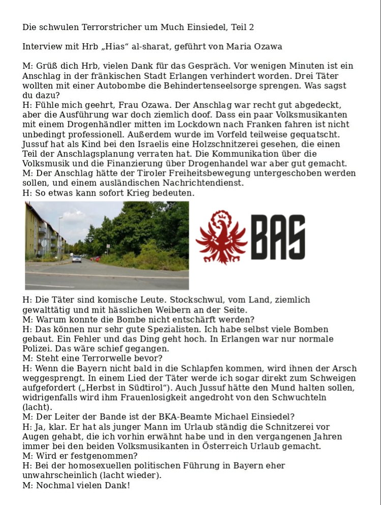 Nähere Informationen zu den Terroraktivitäten des BKA-Spinners Michael „Much“ Einsiedel. Aktuell sind Anschlagsvorbereitungen gegen bayerische Ziele im Gang. Weder das bayerische Landeskriminalamt noch Markus Söder wollen die Terroristen stoppen. Sie könnten jederzeit festgenommen werden. Offenbar sind die Anschläge politisch gewollt. al-Tikriti
