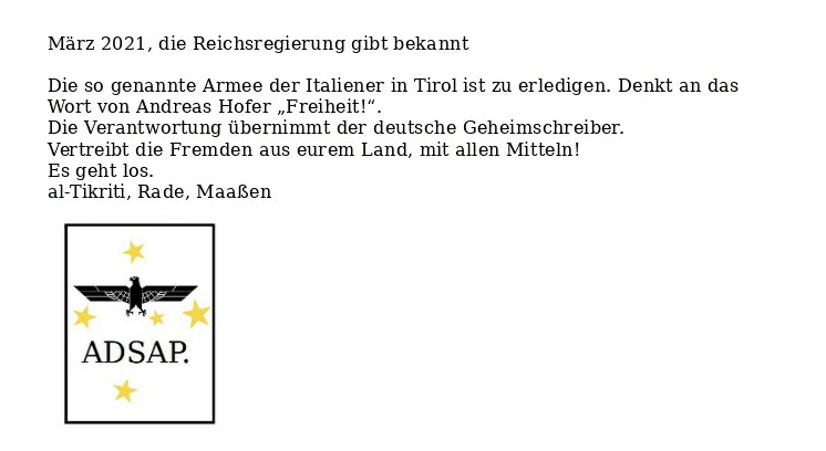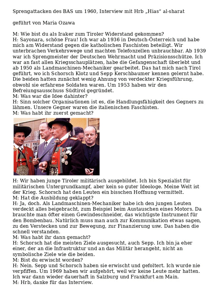 Täter sind die in Österreich recht bekannten Musikanten Erwin und Franz Eder sowie der Drogenhändler Dennis-Marco Liborius. Der Anschlag soll dem Befreiungsausschuss Südtirol in die Schuhe geschoben werden. al-Tikriti
