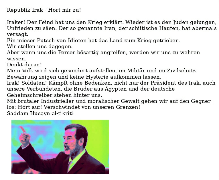Der erste Schritt ist die nationalsozialistische Diktatatur. al-Tikriti ist Machthaber des Landes. Wer sich ihm widersetzt ist des Todes. al-sharat