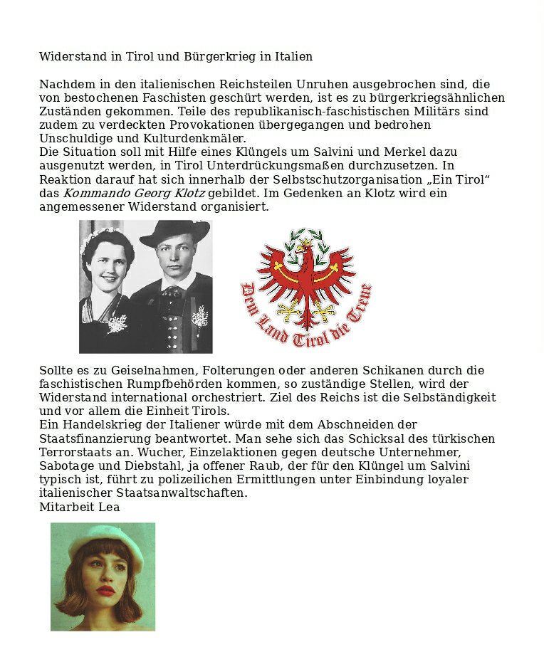 Neuigkeiten aus Tirol Verfasst vongeheimschreiber14. Juni 202014. Juni 2020Veröffentlicht inTirolSchlagwörter:Bürgerkrieg, Ein Tirol, Faschismus, Georg Klotz, Italien, Provokation, Salvini, Tirol Teilen mit: Auf X teilen (Wird in neuem Fenster geöffnet) X Auf Facebook teilen (Wird in neuem Fenster geöffnet) Facebook Gefällt mir Wird geladen … Ähnliche Beiträge Veröffentlicht von geheimschreiber Geboren 1975, Nationalist, lebt in Berlin. Mehr Beiträge anzeigen