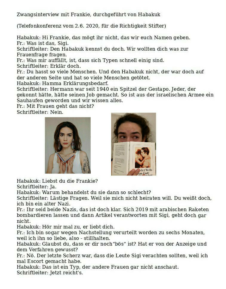 Zwangsinterview Verfasst vongeheimschreiber15. Juni 202016. Juni 2020Veröffentlicht inFrauenSchlagwörter:Frankie, Freundin, Habakuk, Hilfe, Interview, Liebe, Nazi Hier weiterlesen! Teilen mit: Auf X teilen (Wird in neuem Fenster geöffnet) X Auf Facebook teilen (Wird in neuem Fenster geöffnet) Facebook Gefällt mir Wird geladen … Ähnliche Beiträge Veröffentlicht von geheimschreiber Geboren 1975, Nationalist, lebt in Berlin. Mehr Beiträge anzeigen