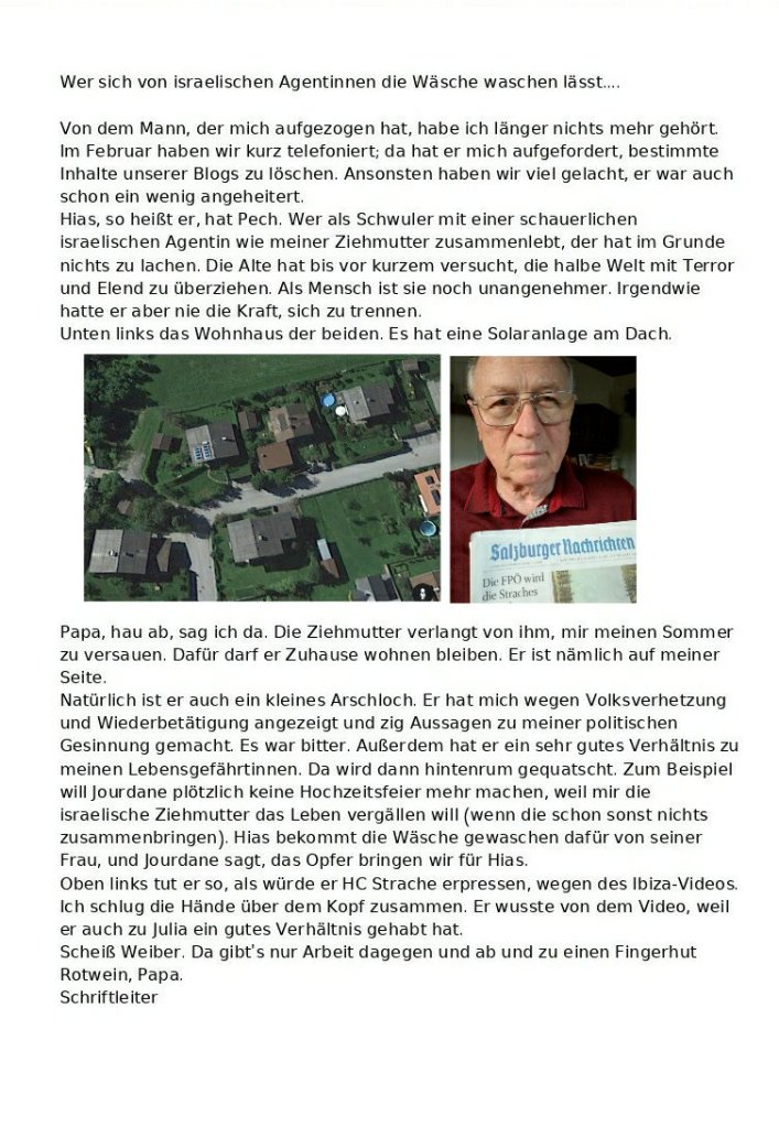 HC, Papa und die Wäsche Verfasst vongeheimschreiber29. Juni 202030. Juni 2020Veröffentlicht inFrauenSchlagwörter:HC Strache, Israel, Papa, Salzburg, Weiberknecht Hintergrundinformationen zum Ibiza-Video Teilen mit: Auf X teilen (Wird in neuem Fenster geöffnet) X Auf Facebook teilen (Wird in neuem Fenster geöffnet) Facebook Gefällt mir Wird geladen … Ähnliche Beiträge Veröffentlicht von geheimschreiber Geboren 1975, Nationalist, lebt in Berlin. Mehr Beiträge anzeigen