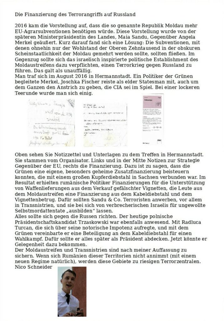 Merkel und die Terrorrepublik Moldau Verfasst vongeheimschreiber29. Juni 202029. Juni 2020Veröffentlicht inTerrorismusSchlagwörter:Angela Merkel, Arbeitskreis NSU, Joschka Fischer, Kabeldiebstahl, Nico Schneider, Radluca Turcan, Republik Moldau, Russland, Terrorismus, Vignettenbetrug Hintergrund-Artikel zum Vignettenbetrug und unser neuer Großrumänien-Blog Teilen mit: Auf X teilen (Wird in neuem Fenster geöffnet) X Auf Facebook teilen (Wird in neuem Fenster geöffnet) Facebook Gefällt mir Wird geladen … Ähnliche Beiträge Veröffentlicht von geheimschreiber Geboren 1975, Nationalist, lebt in Berlin. Mehr Beiträge anzeigen