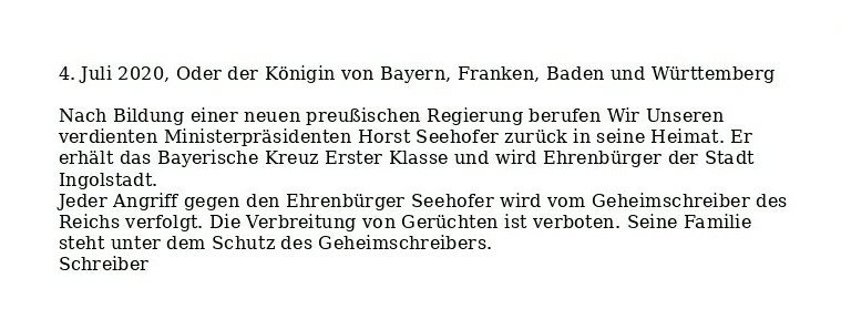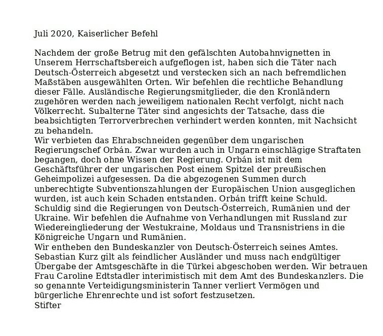 Kaiserlicher Befehl zur Vignetten-Krise Verfasst vongeheimschreiber5. Juli 20205. Juli 2020Veröffentlicht inBefehleSchlagwörter:Österreich, Horst Seehofer, Irak, Kaiserin Anna, Orbán, Sebastian Kurz, Terrorismus, Ungarn, Vignetten-Krise Teilen mit: Auf X teilen (Wird in neuem Fenster geöffnet) X Auf Facebook teilen (Wird in neuem Fenster geöffnet) Facebook Gefällt mir Wird geladen … Ähnliche Beiträge Veröffentlicht von geheimschreiber Geboren 1975, Nationalist, lebt in Berlin. Mehr Beiträge anzeigen