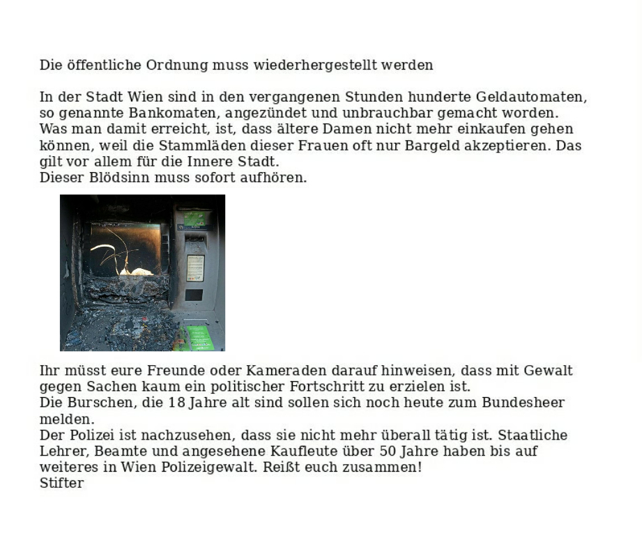 Bankomaten in Ruhe lassen! Verfasst vongeheimschreiber15. Juli 2020Veröffentlicht inBefehleSchlagwörter:Bankomat, Bürgerkrieg, Frauen, Ordnung, Wien Teilen mit: Auf X teilen (Wird in neuem Fenster geöffnet) X Auf Facebook teilen (Wird in neuem Fenster geöffnet) Facebook Gefällt mir Wird geladen … Ähnliche Beiträge Veröffentlicht von geheimschreiber Geboren 1975, Nationalist, lebt in Berlin. Mehr Beiträge anzeigen