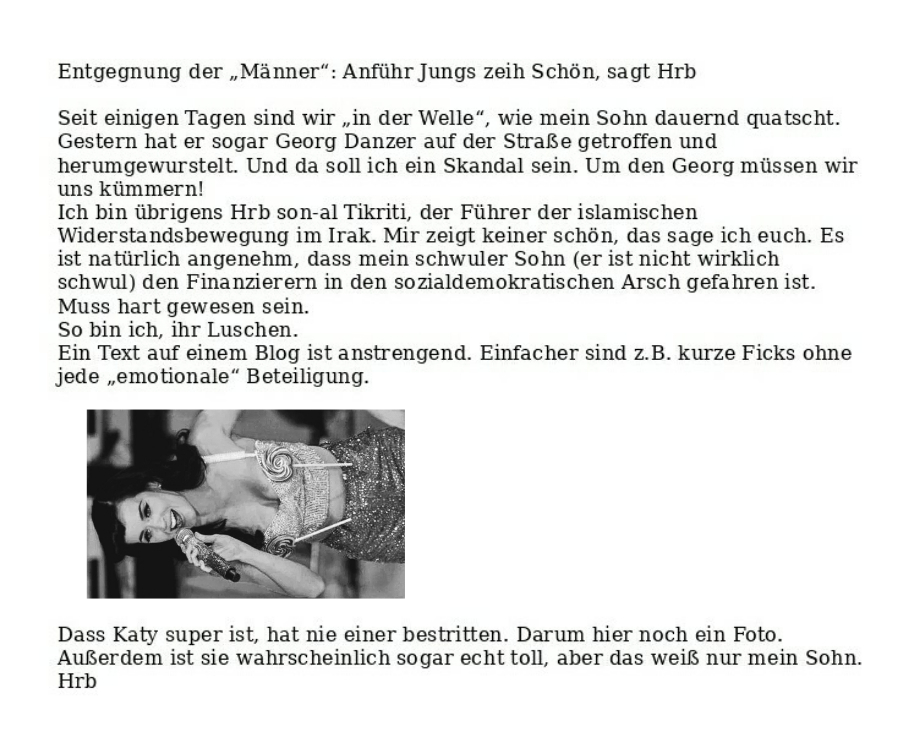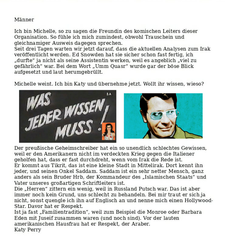 Was jeder wissen muss: Interna Verfasst vongeheimschreiber22. Juli 202022. Juli 2020Veröffentlicht inFrauenSchlagwörter:Islamischer Staat, Katy Perry, Krieg, Liebe, Marylin Monroe, Schlechte Laune, USA Teilen mit: Auf X teilen (Wird in neuem Fenster geöffnet) X Auf Facebook teilen (Wird in neuem Fenster geöffnet) Facebook Gefällt mir Wird geladen … Ähnliche Beiträge Veröffentlicht von geheimschreiber Geboren 1975, Nationalist, lebt in Berlin. Mehr Beiträge anzeigen