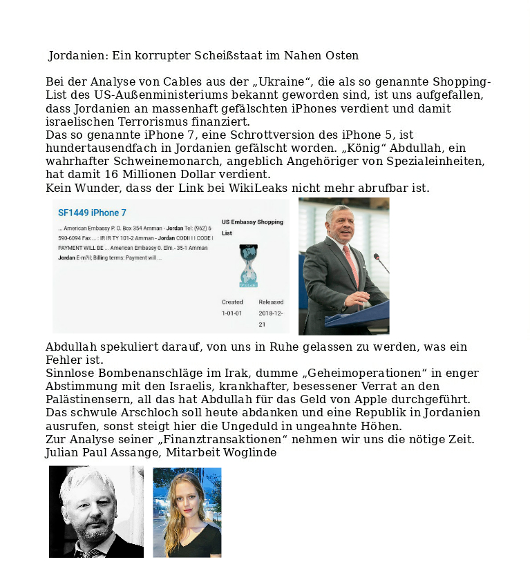 Assange: Jordanien ein Schweinestaat Verfasst vongeheimschreiber9. August 2020Veröffentlicht inAssangeSchlagwörter:Abdullah, iPhone 7, Israel, Jordanien, Julian Assange, Korruption, Terrorfinanzierung Verweis zum letzten Artikel von Assange, Abdullah im Schweinegalopp zum Rücktritt! Teilen mit: Auf X teilen (Wird in neuem Fenster geöffnet) X Auf Facebook teilen (Wird in neuem Fenster geöffnet) Facebook Gefällt mir Wird geladen … Ähnliche Beiträge Veröffentlicht von geheimschreiber Geboren 1975, Nationalist, lebt in Berlin. Mehr Beiträge anzeigen