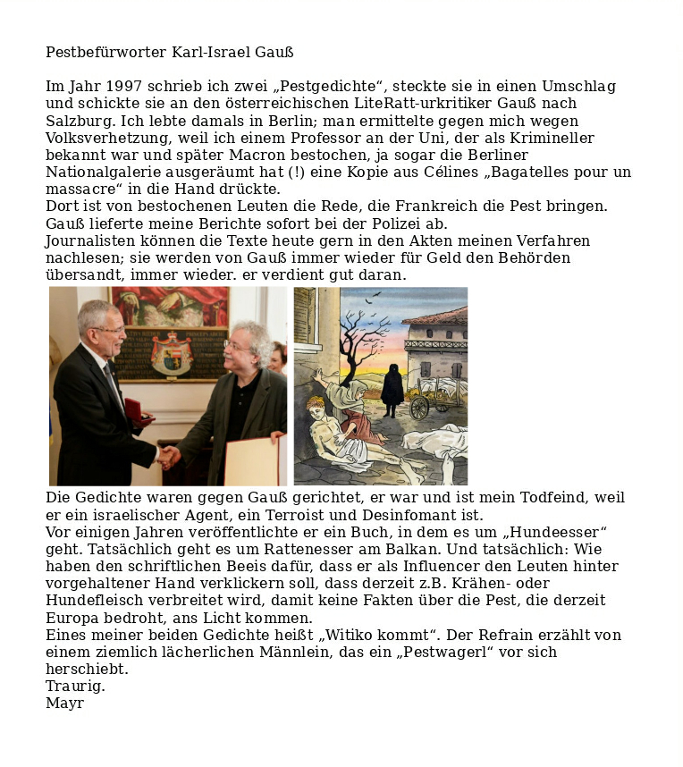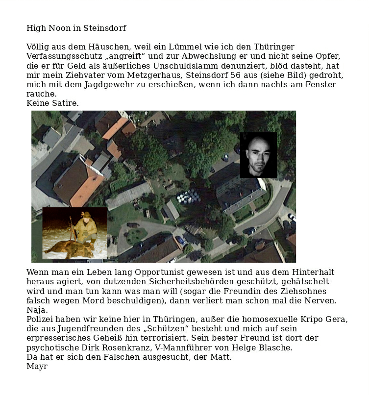 Grüße ans „Bremserhäuschen“ des dreckigen VerfassungsschutzesStandort: Landfleischerei Peter Weiser, Steinsdorf 56, 07570 Steinsdorf bei Gera (Thüringen)Nachlesen!„Des traut a si nit, wei da Vota a Bix hot“ (Das traut er sich nicht zu posten, weil sein Ziehvater ein Gewehr bei sich hat)