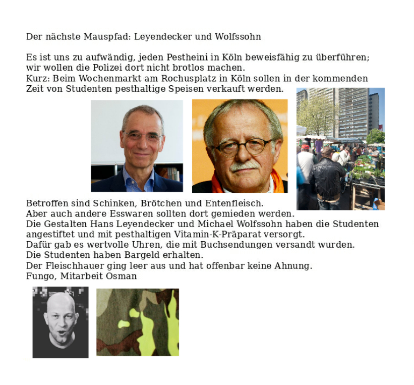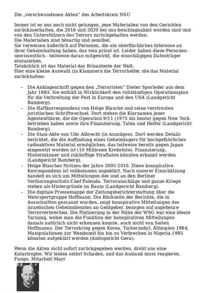 Fungos Nachtdienst Verfasst vongeheimschreiber30. August 202031. August 2020Veröffentlicht inTerrorismusSchlagwörter:9/11, Akten, Amtsgericht Gera, Helge Blasche, Landgericht Bamberg, Tschernobyl, Wehrsportgruppe Hoffmann Gute Nacht 🤡 Pestbruder Sloterdijk and his sister Rimmi 🤡 o.k. Ende 🤡 Teilen mit: Auf X teilen (Wird in neuem Fenster geöffnet) X Auf Facebook teilen (Wird in neuem Fenster geöffnet) Facebook Gefällt mir Wird geladen … Ähnliche Beiträge Veröffentlicht von geheimschreiber Geboren 1975, Nationalist, lebt in Berlin. Mehr Beiträge anzeigen