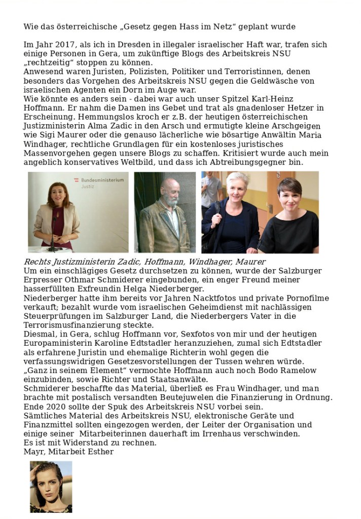 Gesetz „gegen Hass im Netz“ als Resultat von Korruption und Erpressung Verfasst vongeheimschreiber3. September 2020Veröffentlicht inFrauenSchlagwörter:Erpressung, Gesetz gegen Hass im Netz, Karl-Heinz Hoffmann, Karoline Edtstadler, Korruption, Maria Windhager, Sigi Maurer Vor lauter weiblicher Zusammenarbeit rechts und links verwechselt 🐗 Teilen mit: Auf X teilen (Wird in neuem Fenster geöffnet) X Auf Facebook teilen (Wird in neuem Fenster geöffnet) Facebook Gefällt mir Wird geladen … Ähnliche Beiträge Veröffentlicht von geheimschreiber Geboren 1975, Nationalist, lebt in Berlin. Mehr Beiträge anzeigen
