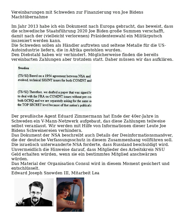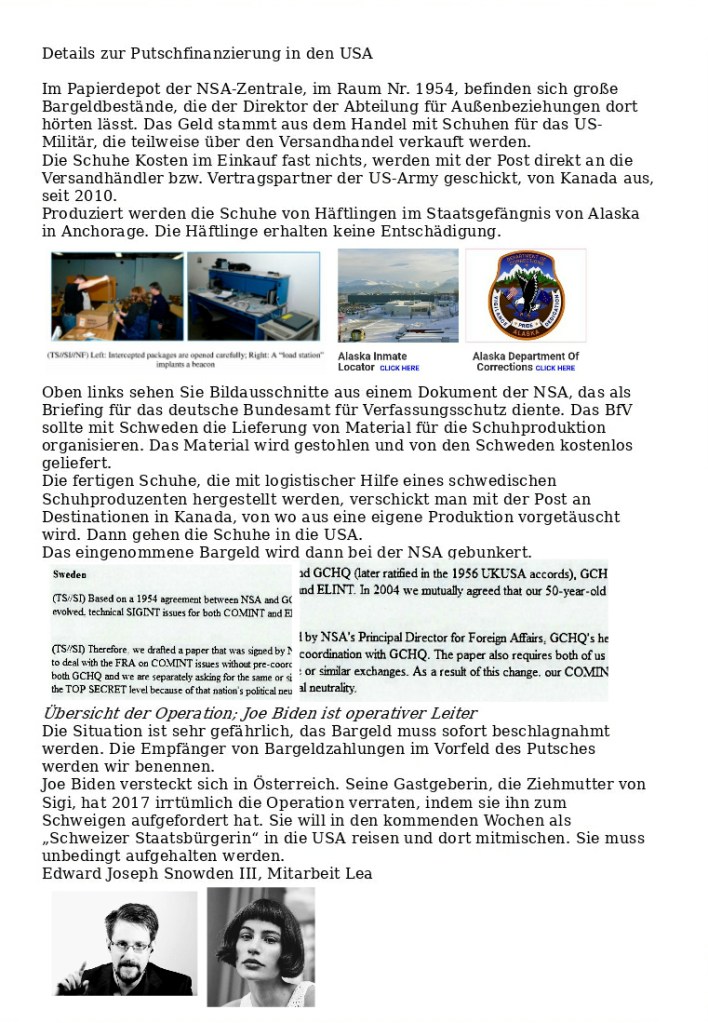 Joe Biden befindet sich derzeit im Holz-Keller der Buchsteinersiedlung 3 in St. Johann im Pongau. Hier das Dokument zum Download.Volle Breitseite 📢Unsere Internetverbindungen werden derzeit blockiert, wir müssen mit Prepaid-SIM-Karten arbeiten, bitte um Verständnis, Dokumente werden nachgereichtAktuelle Sendung zum Putschversuch in den USA! Zum Anhören Logo klickenVerweis zum Dokument der NSA. Damit hier Ende 📢 Kim macht am Preußen-Blog weiter, Ewald