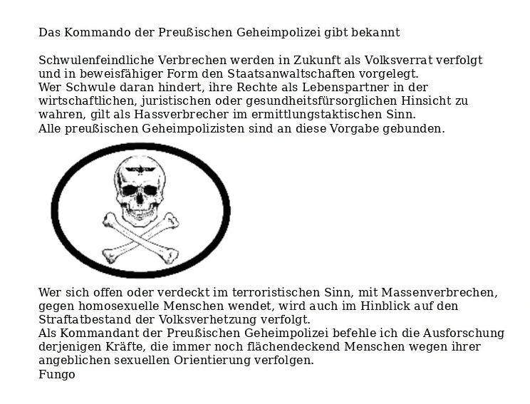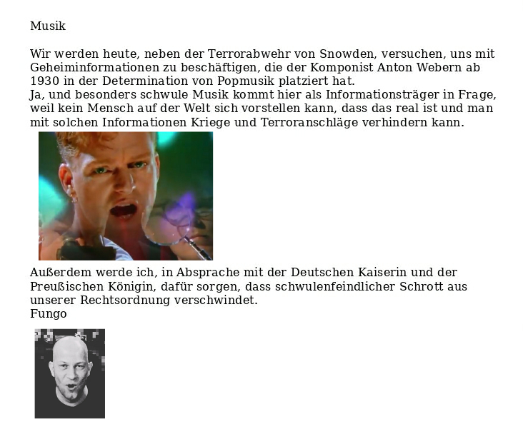 Fungo: Neue Wege Verfasst vongeheimschreiber22. September 202023. September 2020Veröffentlicht inTerrorismusSchlagwörter:Anton Webern, Fungo, Musik, New York, Schwules Leben, Volkswagen Dienstaufsicht Ewald, kann heiter werden mit unserem schwulen Kommandanten Fungo 📢 Hier wird’s ja richtig aktivistisch 📢 Und damit Schluss, weiter mit Assange als Kommandant auf dem Preußenblog 📢 Teilen mit: Auf X teilen (Wird in neuem Fenster geöffnet) X Auf Facebook teilen (Wird in neuem Fenster geöffnet) Facebook Gefällt mir Wird geladen … Ähnliche Beiträge Veröffentlicht von geheimschreiber Geboren 1975, Nationalist, lebt in Berlin. Mehr Beiträge anzeigen