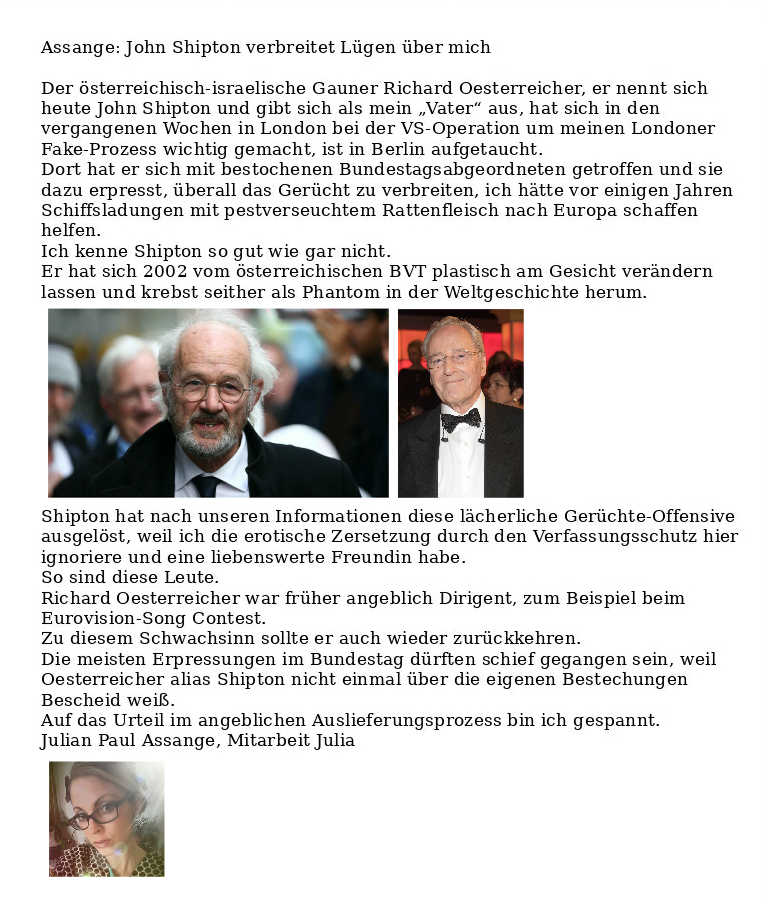 Assange: John Shipton ist nicht mein Vater und lügt Verfasst vongeheimschreiber9. Oktober 2020Veröffentlicht inAssangeSchlagwörter:Berlin, Bundestag, John Shipton, Julian Assange, Lüge, Richard Oesterreicher Verweis zu einer PDF-Sicherung des Berichts der BZ 📢 Teilen mit: Auf X teilen (Wird in neuem Fenster geöffnet) X Auf Facebook teilen (Wird in neuem Fenster geöffnet) Facebook Gefällt mir Wird geladen … Ähnliche Beiträge Veröffentlicht von geheimschreiber Geboren 1975, Nationalist, lebt in Berlin. Mehr Beiträge anzeigen