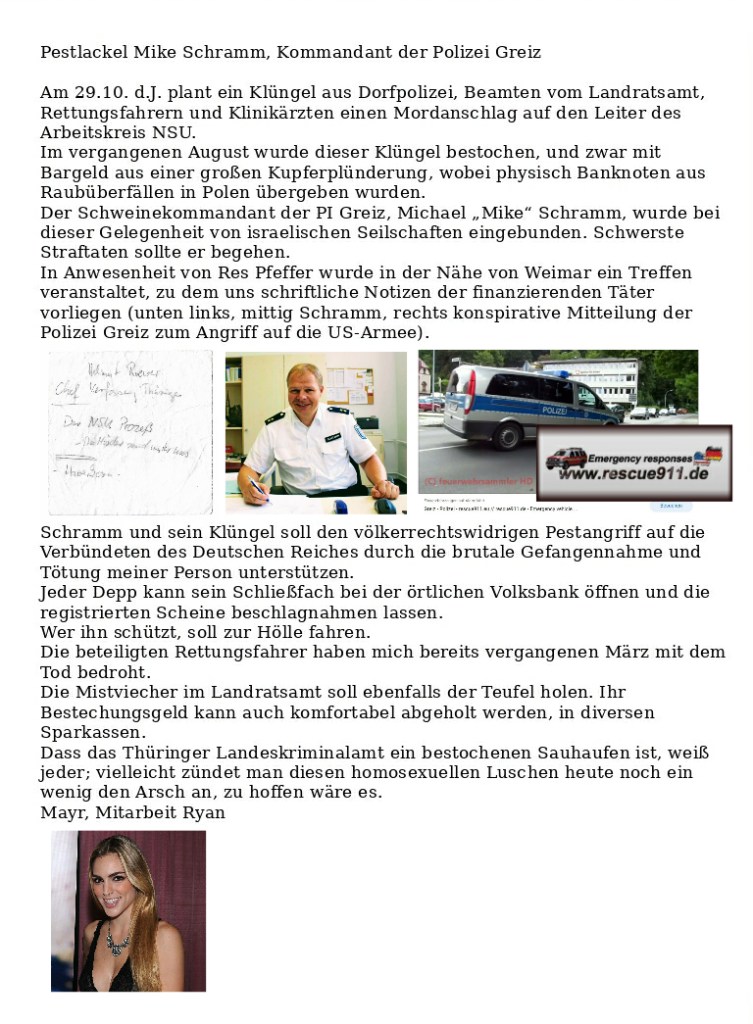 Identitäres Pestgesindel mit neuer Identität Verfasst vongeheimschreiber12. Oktober 202012. Oktober 2020Veröffentlicht inTerrorismusSchlagwörter:Britanny Pettibone, Gesichtschirurgie, Hans Peter Meißnitzer, Identitäre Bewegung, Kokain, Pest, Steiermark Heiliger Strohsack 📢 📢 Downloadmöglichkeit Schreiben Langer Teilen mit: Auf X teilen (Wird in neuem Fenster geöffnet) X Auf Facebook teilen (Wird in neuem Fenster geöffnet) Facebook Gefällt mir Wird geladen … Ähnliche Beiträge Veröffentlicht von geheimschreiber Geboren 1975, Nationalist, lebt in Berlin. Mehr Beiträge anzeigen