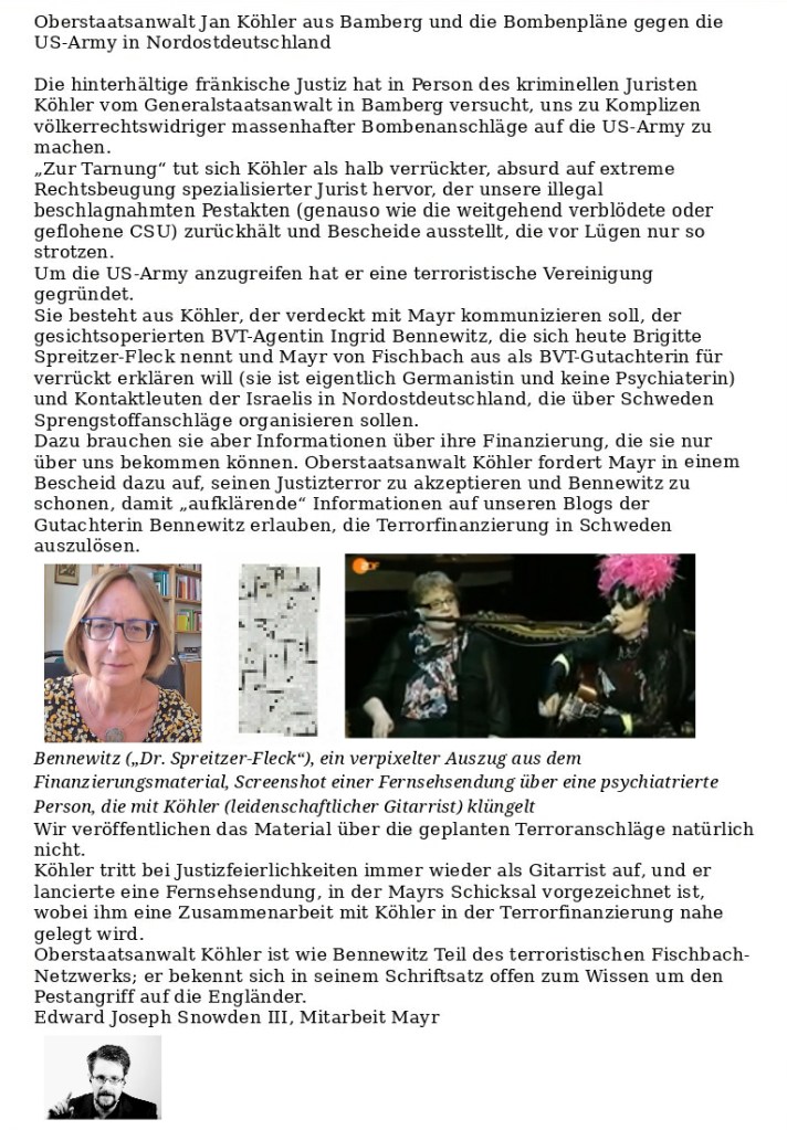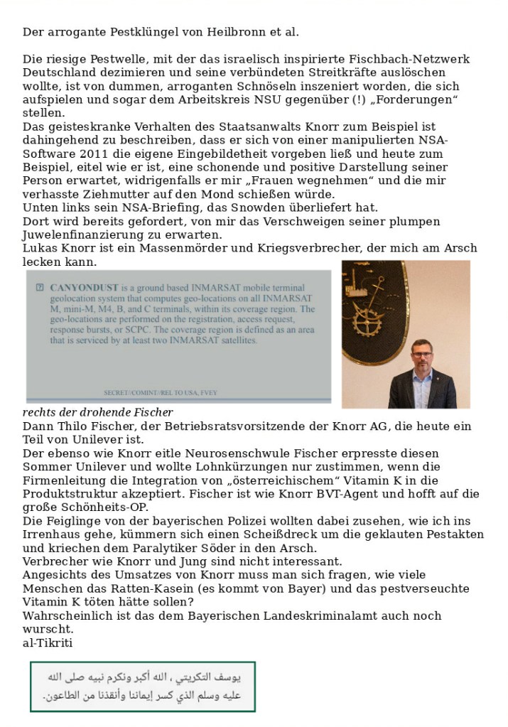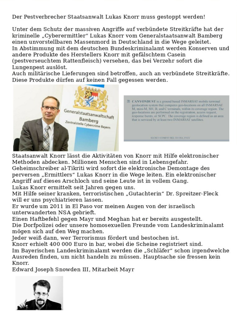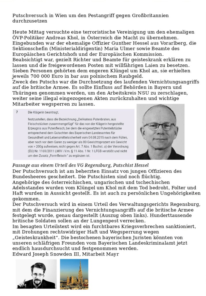 Snowden: Putschversuch in Wien und Pestangriff auf die britische Armee Verfasst vongeheimschreiber15. Oktober 202016. Oktober 2020Veröffentlicht inAustriaSchlagwörter:Andreas Khol, Armee, Großbritannien, Gunther Hessel, Kriegsverbrechen, Maria Ulmer, Pest, Putschversuch, Wien Dienstaufsicht heute Schwarzenberg 🗝️ Um Haaresbreite 🗝️ Verweis zum Urteil des VG Regensburg Hier kann Köhlers (ein Gundolf Köhler war ins Oktoberfestattentat verstrickt) Schriftsatz heruntergeladen werden 🗝️ Knorrs NSA-Briefing kann hier heruntergeladen werden Traurig 🗝️ Teilen mit: Auf X teilen (Wird in neuem Fenster geöffnet) X Auf Facebook teilen (Wird in neuem Fenster geöffnet) Facebook Gefällt mir Wird geladen … Ähnliche Beiträge Veröffentlicht von geheimschreiber Geboren 1975, Nationalist, lebt in Berlin. Mehr Beiträge anzeigen