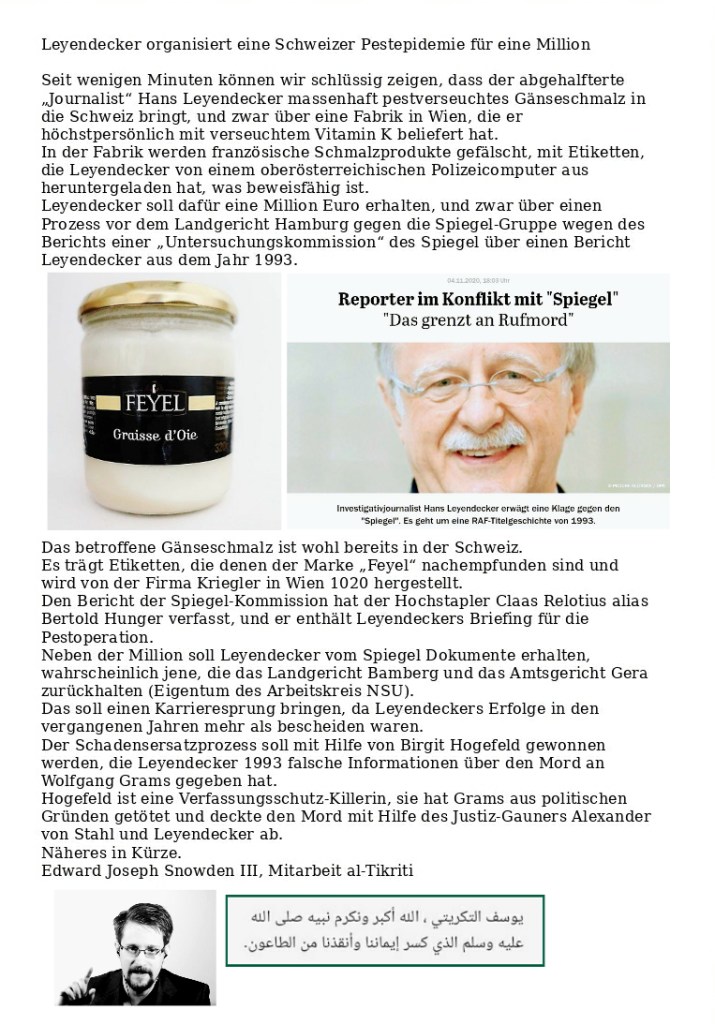 Die Pestakten des Arbeitskreis NSU werden derzeit noch aufgrund einer Strafanzeige von Leyendecker gegen al-Tikriti zurückgehalten! Er will sie zu Geld machen, AZ ST/0253139/2020, Kripo Gera.