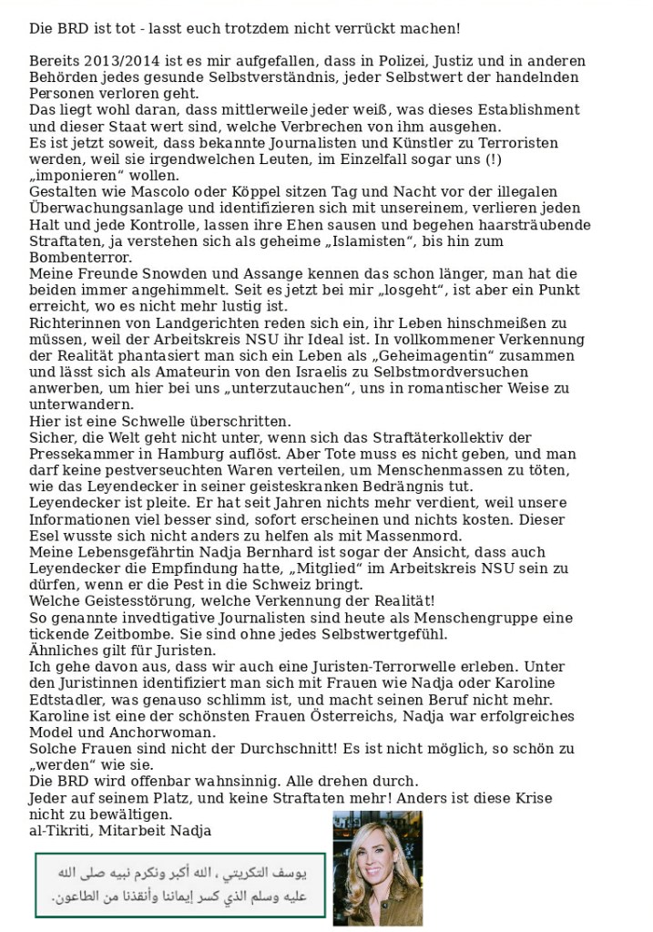 Nach Recherchen meiner Lebensgefährtin Julia bereitet sich die bestochene Richterin am Landgericht Dr. Kerstin Gronau derzeit mit Liebeskugeln (!) auf eine „Mitgliedschaft“ im Arbeitskreis NSU vor. Außerdem macht sie eine Diät und postet in diesem Moment auf Pinterest Liebesbotschaften (links oben). Gronau will, dass sie für ihre Bestechlichkeit beschuldigt wird und beabsichtigt, dann unterzutauchen. Sie soll verseuchtes Entenfleisch für Asia-Imbisse transportiert haben (Firma Kriegler). Ich will sie nicht! 🏃 al-Tikriti