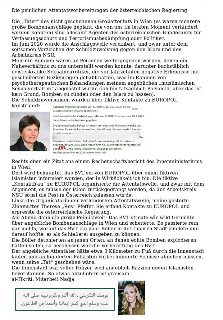 Hier Dienstaufsicht Habakuk 🤡 er ist zwar tatsächlich Polyamid, aber mehr noch polyamorBericht der ARD: Gewarnter Täter (!?), so etwas kann man nicht erfinden. Ob Kurz nun schon aus der Haft entlassen ist oder nicht weiß keiner 🤡Aktueller Aufenthaltsort der Organisatorin des Attentatsversuchs „Res“ Pfeffer: Eine Zeugenschutzwohnung des BVT in Nürnberg, Leipziger Platz 🤡 mit Gruß an das BLKA, und damit Schluss hier