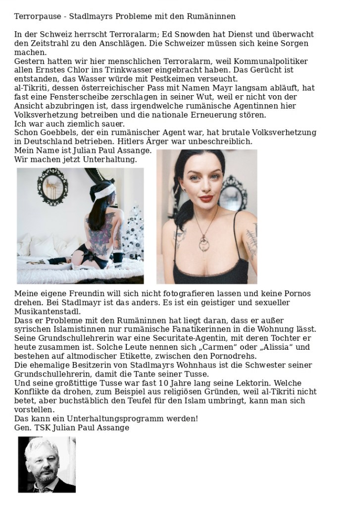 Fesche Weiber und ein guter Fick sind mir lieber als der homosexuelle Julian Assange, der sich hier wichtig macht. Mayr 🤡 ok