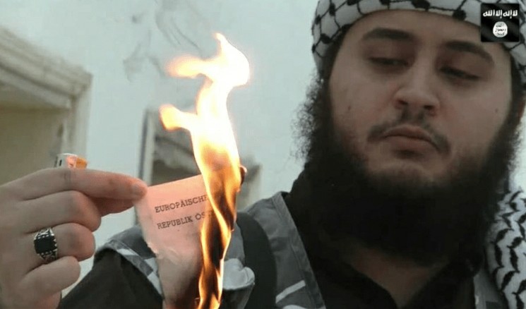 Rechts sehen Sie Mohammed Mahmoud, der bis 1995 Roland Norcen hieß. Links sein Auftreten um 2015. Norcen war ein echter Extremist, ein radikaler Islamist. Unser Stadlmayr hat ihn 1992/1993 verbal zum Extremisten gemacht, und Norcen war der Ansicht, dass er für ihn arbeitet. Man sieht sein trauriges, extremistisches Gesicht. Ein echter Fanatiker. al-Tikriti ist von uns mit einem „Sprechverbot“ belegt worden, weil er junge Leute in den Dschihad hetzt.