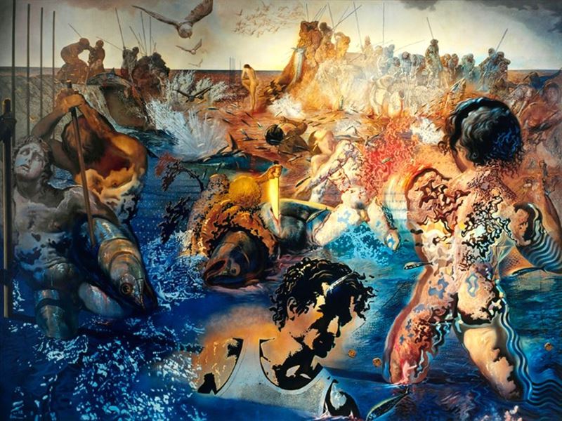 Das Gemälde „Der Thunfischfang“ von Dali liefert das Rahmenkonzept für die kulturelle Grundierung des industriellen Aufbruchs; links oben ein Standbild aus dem Film „Girls Girls Girls!“ mit Elvis Presley, in dem wirtschaftspsychologische Vorschläge zur Krisenbewältigung gemacht werden.