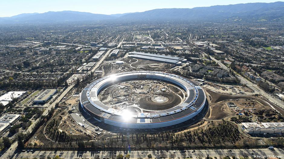 Die Apple-Zentrale in Silicon Valley. Gelingt es nicht, sie in eine Art Gehirn der neuen Fischindustrie umzubauen, droht den USA der Untergang. Teure Importe stehen bereit; sie sind an Bedingungen wie industriellen Rückbau (Stahl, Autos, Chemie usw.) geknüpft. Steve Jobs hat seine Zentrale wie eine Thunfischdose aussehen lassen.