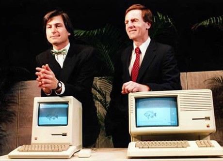 Links John Palladino, rechts Steve Jobs und Kollege. Auf den Bildschirmen sind Thunfische zu erkennen. Jobs galt als „Sohn“ von Palladino und wusste um das Ende von Apple.