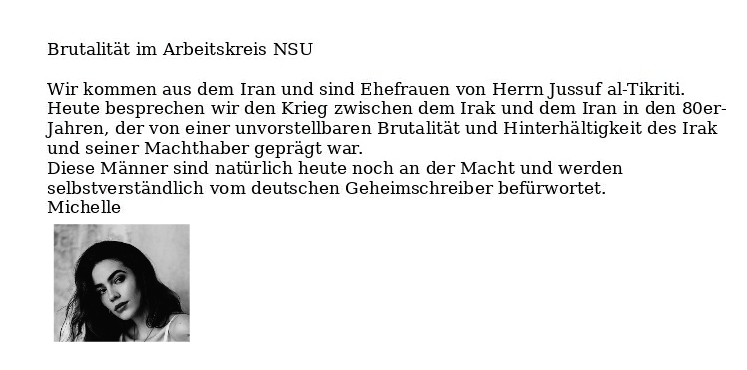 Die Hässlichkeit iranischer Tussen. Das ist Michelle. Sie ist nicht schön, liebt mich nicht und bildet sich ein, fanatische Schiitin zu sein. Man sieht sofort, dass sie Alkoholikerin ist und mit mir nichts zu tun hat. al-Tikriti