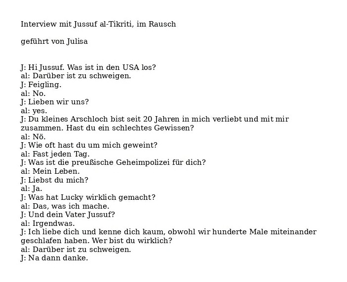 Unter dem Kommando von Julisa werden wir heute Projekte meines Onkels Lucky, der eigentlich hrb al-sharat geheißen hat, besprechen. Bis bald. al-tikriti