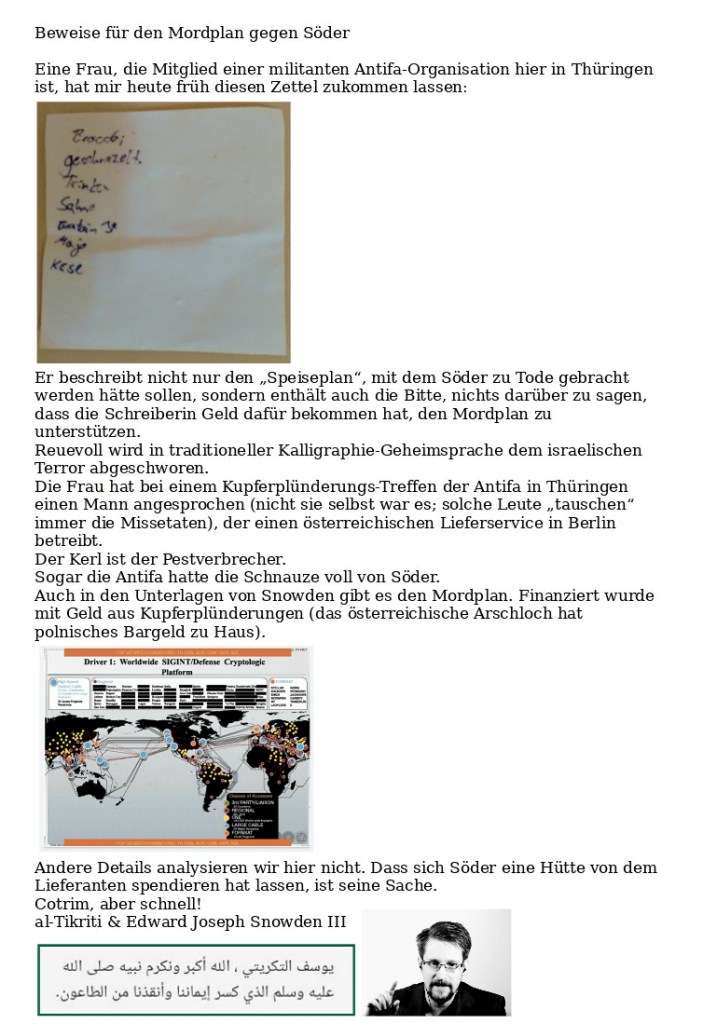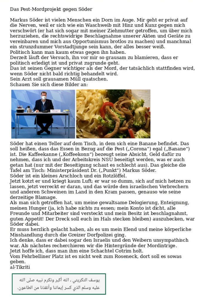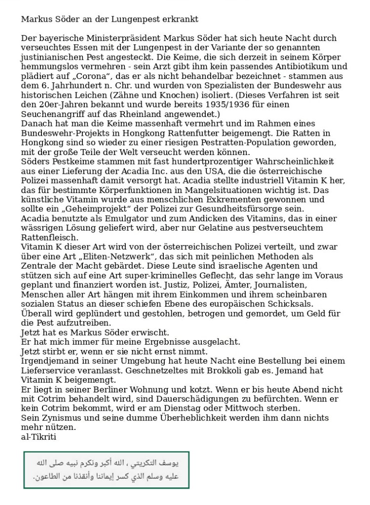 Wir wir eben aus seinem Umfeld erfahren haben, ist der bayerische Ministerpräsident Markus „Wir wissen mehr“ Söder heute früh an der Lungenpest erkrankt. Er soll sich mit Geschnetzeltem plus Broccoli infiziert haben, in dem Glauben, dass ihm sein Mundschutz was hilft.